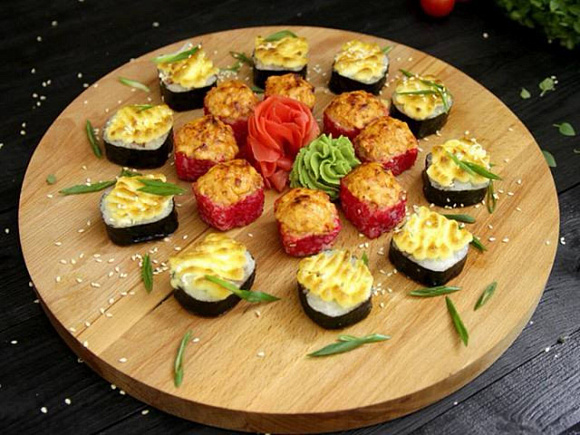 Классика с огурцом, Классика с омлетом, Филадельфия лайт, Цезарь, Запеченный с мидиями, Темпура с крабом, имбирь, васаби, соевый соус.